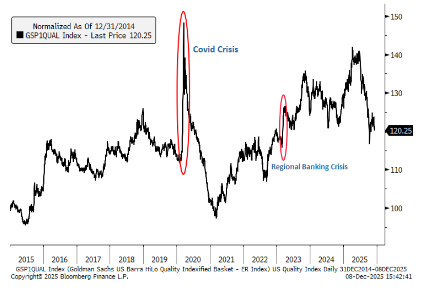 • Corto beta (GSP1BETA) y largo calidad (GSP1QUAL), basándonos en análisis históricos que muestran que estos factores reaccionan con mayor intensidad durante ventas generalizadas del mercado.