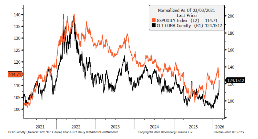 Para implementaciones market neutral, nuestro Wolfe Oil Pair (GSPUOILY) sigue de cerca el comportamiento de los futuros de crudo en el tramo corto de la curva.