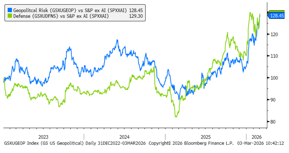 En comparación con el S&P 500 excluyendo IA (SPXXAI), esta cesta sube aproximadamente un 23% en lo que va de año, impulsada principalmente por las compañías de defensa y las empresas vinculadas al petróleo.