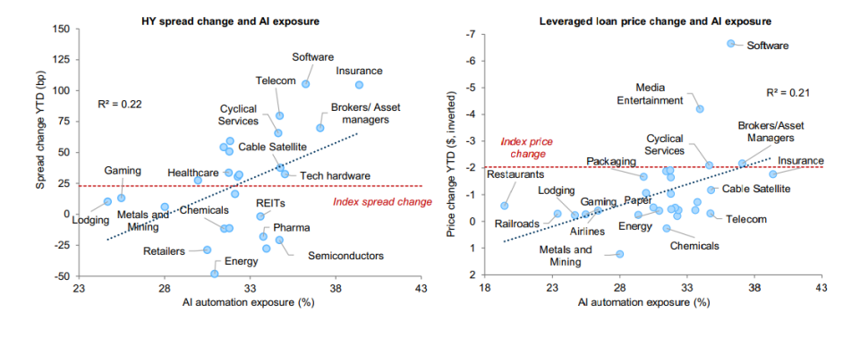 Partiendo de valoraciones históricamente exigentes, los inversores han comenzado a exigir mayores primas de riesgo a emisores en industrias más expuestas a la disrupción impulsada por la IA, reflejando una creciente reticencia a financiar modelos de negocio percibidos como especialmente vulnerables.