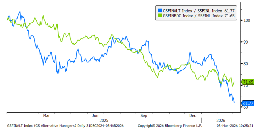 Tras la caída del sector software, el foco se ha desplazado hacia los gestores de activos alternativos (GSFINALT) y las Business Development Companies – BDCs (GSFINBDC), debido a las dudas sobre su valor terminal.