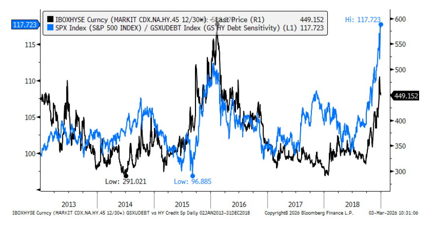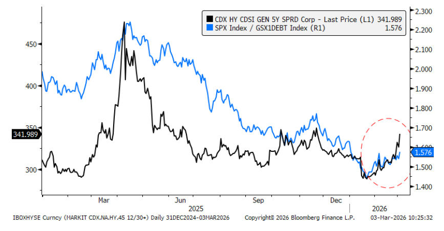 El equipo de investigación de crédito señala que, desde los mínimos de spreads registrados el 22 de enero, los índices de high yield en dólares se han ampliado en 39 puntos básicos, quedando claramente por detrás de la renta variable en términos ajustados por beta.