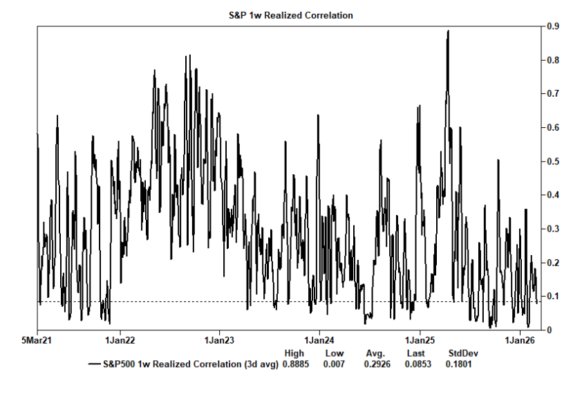 De cara a las próximas sesiones, el straddle semanal implica un movimiento del 2,85%. Seguiremos observando el tema de dispersión, ya que la correlación realizada a una semana sigue siendo extremadamente baja, alrededor del percentil 10 en una comparación de cinco años.