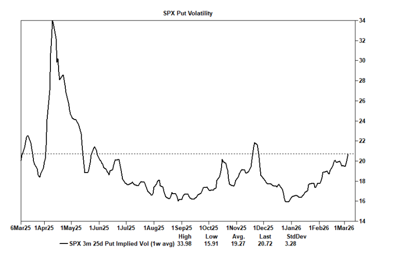 Puts, donde el sesgo put/call a 1 mes del S&P 500 se sitúa en su nivel más alto en cuatro años, mientras que la volatilidad de puts a 3 meses ha registrado su tercera lectura más alta desde junio.