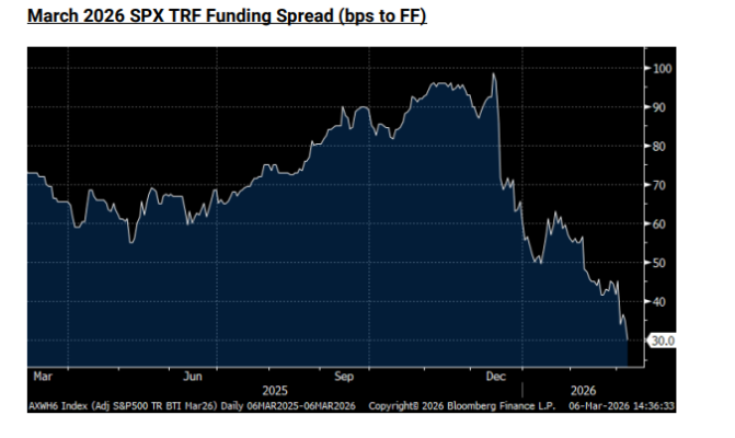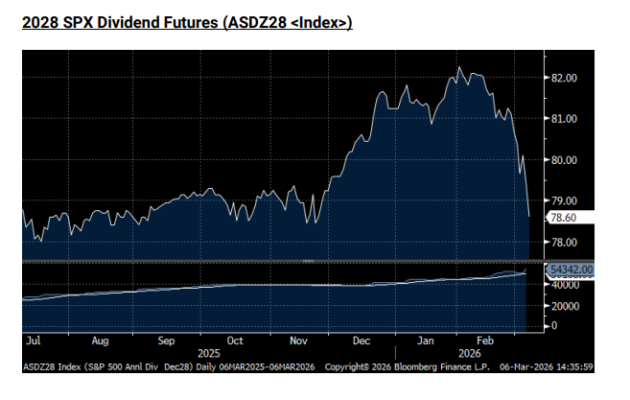 Aunque el SPX ha mostrado relativa resiliencia, bajo la superficie tanto la financiación implícita como los dividendos a futuro han sufrido presión esta semana. La financiación implícita de marzo de 2026 está marcando nuevos mínimos antes del periodo de roll, que comenzará a activarse hacia finales de la próxima semana. Además, los futuros de dividendos del S&P 500 han caído de forma significativa, con la curva ahora implicando crecimiento negativo de dividendos durante los próximos 2-3 años.