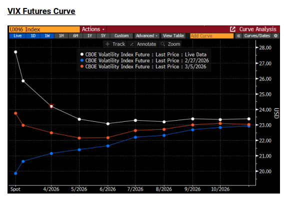 No solo la curva de volatilidad por strike fijo está invertida, sino que la curva de futuros del VIX también se ha invertido, lo que refleja el elevado nivel de miedo e incertidumbre en el corto plazo.