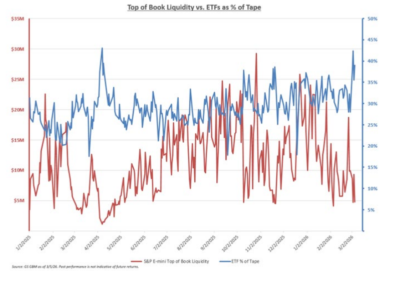 Los flujos de la mesa durante la semana reflejaron un trading macro de arriba hacia abajo, con el porcentaje de ETFs en el volumen total del mercado superando de forma constante el 40% (uno de los niveles más altos observados). La liquidez también estuvo muy deteriorada, lo que amplificó los movimientos de precios.