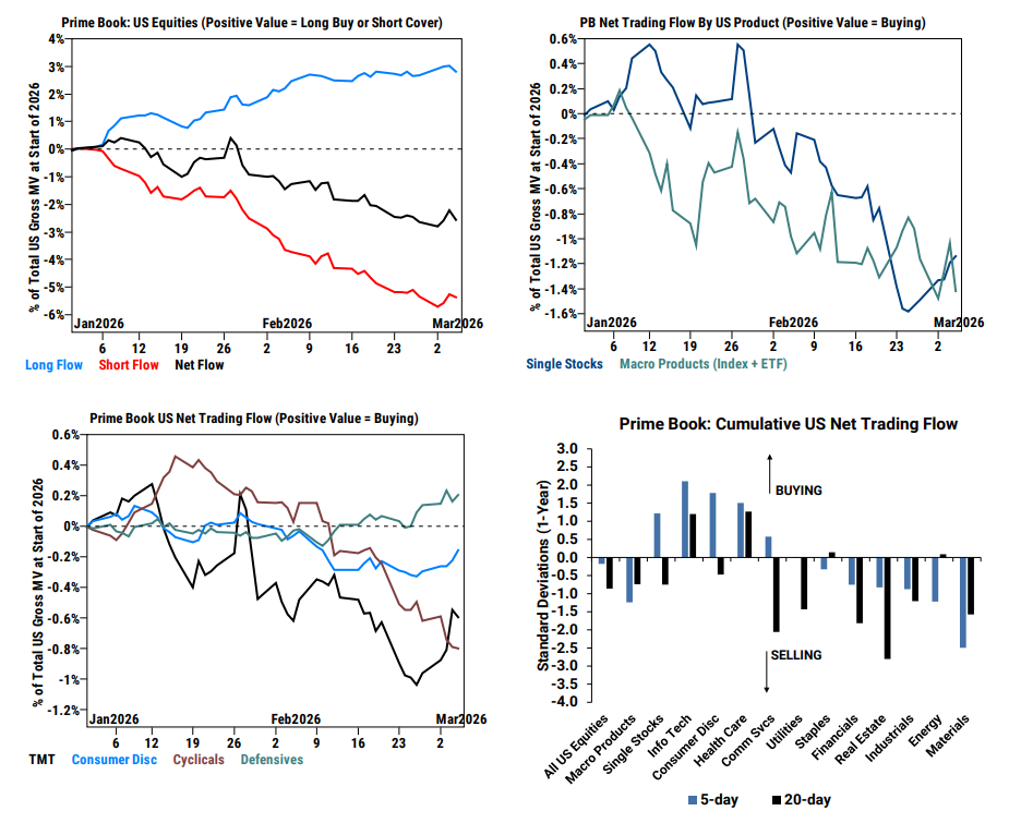 Flujos de trading (27 de febrero – 5 de marzo): las acciones estadounidenses fueron vendidas netamente por tercera semana consecutiva (-0,2 desviaciones estándar frente al promedio de 1 año), impulsadas por ventas tanto en posiciones largas como cortas en productos macro, parcialmente compensadas por compras en posiciones largas y cierre de cortos en acciones individuales. Los flujos diarios fueron volátiles, ya que los hedge funds vendieron netamente acciones estadounidenses de viernes a lunes, compraron netamente martes y miércoles, y volvieron a vender el jueves.