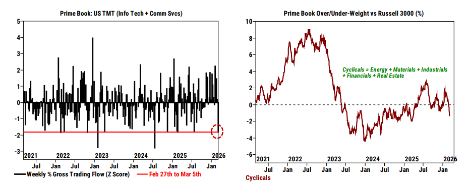 ▪ Prime: Las acciones estadounidenses fueron vendidas netamente por tercera semana consecutiva, impulsadas por ventas tanto en posiciones largas como cortas en productos macro, parcialmente compensadas por compras en posiciones largas y cierre de cortos en acciones individuales. Los cortos en ETFs listados en EE. UU. aumentaron un +8,3%, el segundo mayor incremento en los últimos cinco años, lo que apunta a una actividad de cobertura elevada. Aunque las acciones individuales fueron compradas netamente en conjunto, conviene señalar que 1) 7 de los 11 sectores registraron ventas netas (es decir, la amplitud de las compras fue limitada), impulsadas por ventas continuadas en cíclicos, y 2) las acciones de TMT experimentaron un desapalancamiento generalizado (el mayor desde julio de 2024), liderado por cierre de cortos en software.