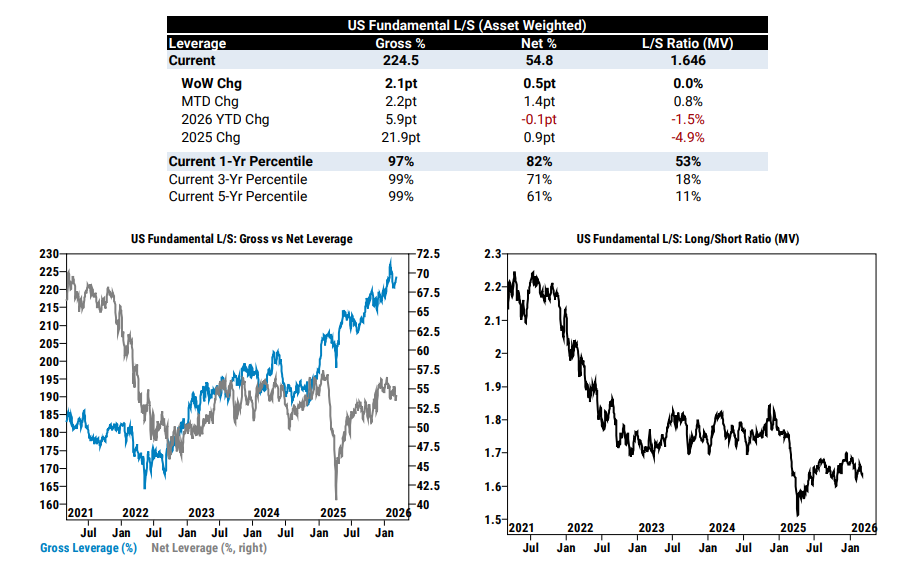 La actividad en acciones individuales fue limitada, con gestores de activos mayormente paralizados y flujos terminando casi planos, ya que la oferta macro fue compensada por la demanda en el sector salud. Los hedge funds terminaron la semana como compradores netos por +2.000 millones de dólares, impulsados por cierres dispersos de posiciones cortas en software. Además, el mercado absorbió más de 20.000 millones de dólares en nuevas emisiones globales durante la semana.
