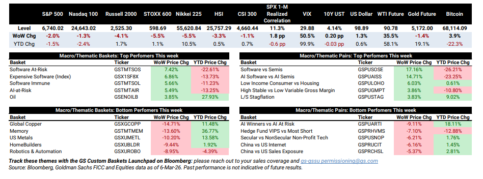 Las acciones estadounidenses terminaron la semana claramente a la baja, con una reestructuración a la baja en los cíclicos tras un dato de empleo (NFP) sorprendentemente débil, mientras que el VIX y el petróleo continuaron reajustándose al alza en medio de titulares geopolíticos negativos y la posibilidad de que la estanflación vuelva a estar sobre la mesa. Software, “AI-at-Risk” y petróleo estuvieron entre los temas que mejor rendimiento tuvieron esta semana, mientras que memoria, metales de EE. UU. y constructoras de viviendas estuvieron entre los que peor comportamiento mostraron.