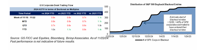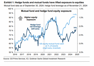 - Tanto los fondos de cobertura como los fondos mutuos han aumentado su exposición larga al mercado de acciones desde el inicio del tercer trimestre. Los fondos de cobertura aumentaron significativamente su apalancamiento neto tras las elecciones de EE. UU. de 2024, mientras que redujeron el apalancamiento bruto, en línea con episodios históricos de elecciones presidenciales. El apalancamiento neto ahora se encuentra cerca del nivel más alto del último año, mientras que el apalancamiento bruto sigue elevado. Los saldos de efectivo de los fondos mutuos han seguido cayendo desde el inicio del tercer trimestre hasta el punto de datos más reciente en septiembre y ahora han alcanzado un mínimo histórico del 1.4%.