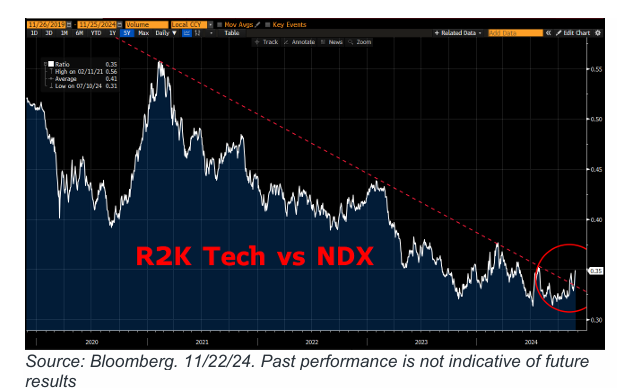 DEBATE SOBRE TECNOLOGÍA (Callahan)… Puntos de discusión y debates: Con pocas “barreras de seguridad” en el mercado en las próximas dos semanas (la próxima semana = poca asistencia, luego los NFP no hasta el 6/12) — el sentimiento de los inversores en Tecnología se siente “sólido”, aunque con algunos debates y tensiones en curso, liderados por: 1) Software vs. Semiconductores hacia 2025 (sigue siendo un gran tema de conversación entre todos los tipos de inversores), 2) qué hacer con las ideas “favoritas” de 2025 que ya han “funcionado” (especialmente en Internet), 3) cómo pensar en los movimientos al alza en SMID Tech / Growth (¿qué detiene este Momentum?!), 4) el continuo retroceso en los cíclicos globales – ¿es momento de comprar? y 5) opiniones y noticias sobre (potenciales) nombramientos y políticas…