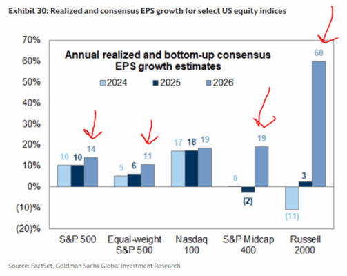 Al pensar en dónde podrían ir las revisiones en 2026, este gráfico de B. Snider / GIR me llamó la atención: el consenso anticipa aceleraciones interanuales notables del crecimiento del BPA en todos los sectores salvo TMT (el **Nasdaq 100 / NDX).