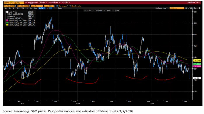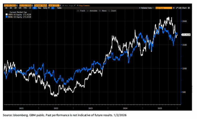 Uber Technologies (UBER) + Booking Holdings (BKNG): no hay una tesis clara aquí, más allá de que sigue siendo llamativo que ambas cerraran el viernes con una capitalización idéntica (≈171.000 M$). Además, se espera que las dos generen ~11.000 M$ de EBITDA en 2026. Ambas acciones siguen siendo muy debatidas de cara a 2026, en un contexto de cambios estructurales en las plataformas de Internet (IA + vehículos autónomos).