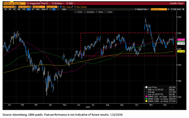 Amazon (AMZN): junto con MSFT, diría que AMZN ha sido una de las acciones más frustrantes para los inversores, ya que ha permanecido claramente en rango durante más de 6 meses, pese a varias narrativas atractivas: mejora de márgenes/EBIT en Retail, reaceleración de AWS, repunte de ingresos publicitarios, y potencial de ahorro de costes vía robótica e IA, entre otras.