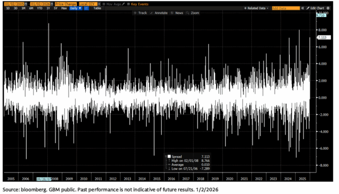 El primer día de negociación de 2026 volvió a mostrar muchos de los rasgos característicos de 2025. El Nasdaq (NDX) registró el viernes una reversión intradía de ~200 pb a la baja, a medida que reaparecían señales de escasa amplitud en el mercado. Al mismo tiempo, el VIX cerró a la baja (zona 14), mientras que la volatilidad de acciones individuales volvió a superar a la volatilidad del índice, con una sensación de “suma cero” en la acción de precios de las grandes tecnológicas.