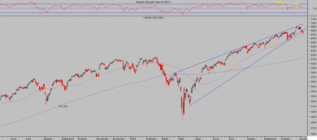 Otra nueva divergencia se refleja en el hecho de que antes de la caída del SP500 en marzo, el 65,4% de las acciones estaban en positivo en 2025 y desde entonces ese porcentaje no ha conseguido mejorar, hoy apenas la mitad de los componentes siguen en verde, a pesar de que el índice cotiza cerca un +12% sobre los máximos de entonces.