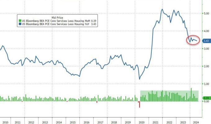 Bajo el capó, la deflación de los bienes duraderos continúa presionando a la baja el PCE básico, mientras que los costos de los servicios siguen aumentando… Más notable aún es que el llamado SuperCore PCE subió un 0,2% intermensual y un 3,43% interanual, cifra que se encuentra incómodamente estancada en niveles elevados. Este es el 50° aumento mensual consecutivo en los precios de SuperCore mientras los costos de la atención médica se disparan…