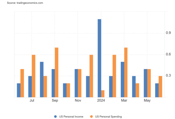 El índice de precios de los gastos de consumo personal (PCE) en los EE. UU. subió un 0.1% mes a mes en junio de 2024, luego de una lectura plana en mayo, en línea con las previsiones. Los precios de los servicios aumentaron un 0.2% y el costo de los bienes disminuyó un 0.2%. La tasa anual del PCE disminuyó al 2.5% desde el 2.6% esperado