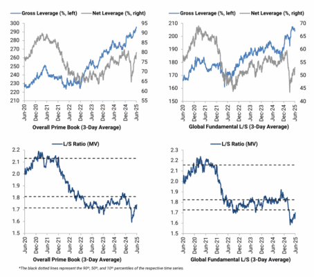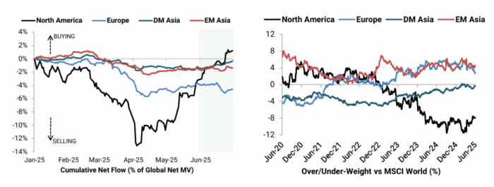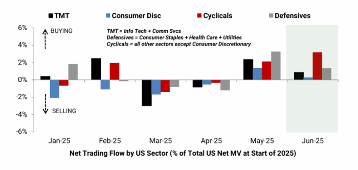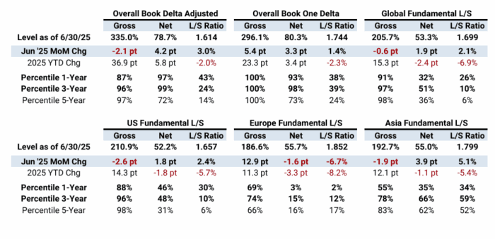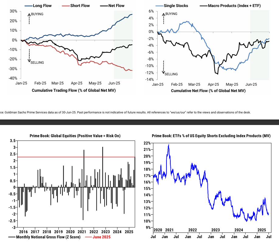 Los hedge funds compraron acciones globales netas en junio, aunque a un ritmo más lento que en mayo (+1,1 desviaciones estándar frente a +2,0 en el último año), mientras que la actividad bruta global de trading aumentó por undécimo mes consecutivo, con el mayor incremento nominal desde septiembre de 2022, impulsado por compras largas que superaron a las ventas en corto.