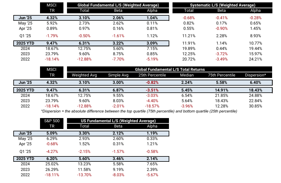 Excluyendo el componente beta, el alfa de los fondos Fundamental L/S fue de +1,04 % en junio, el mejor desempeño mensual desde octubre de 2024, con un alfa en el lado largo de +1,49 % parcialmente compensado por pérdidas en el lado corto de -0,45 %.