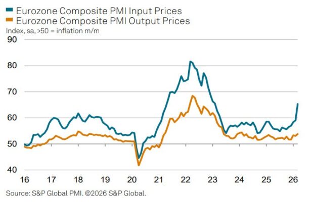 “Los PMI de marzo indican que la economía de la eurozona ya ha sido golpeada con fuerza por la guerra en Oriente Medio. Las señales positivas de crecimiento observadas a comienzos de año han desaparecido debido al aumento de los precios de la energía, las disrupciones en las cadenas de suministro, la volatilidad de los mercados financieros y una renovada caída de la demanda.