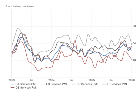 - PMI de Servicios HCOB de la zona euro — enero (final): 51,6 (est. 51,9; prev. 51,9)