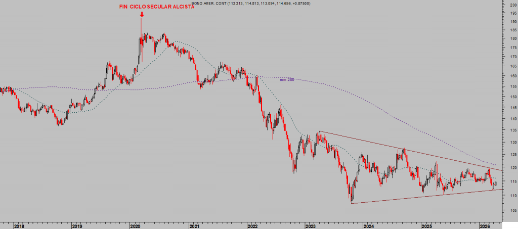 El T-Bond (bono del Tesoro a 30 años) se mueve actualmente en zona de mínimos de los últimos años, en niveles que coinciden con el suelo de una figura técnica bien definida y de gran relevancia. Esta configuración técnica se caracteriza por unos límites o directrices muy claras (soporte y resistencia) que han sido respetadas con una precisión notable cada vez que el precio los ha alcanzado en los últimos 3 años