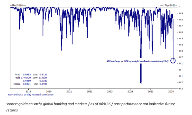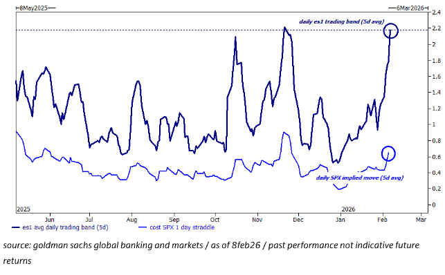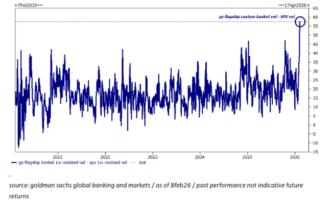 La volatilidad realizada a 1 semana de las cestas de renta variable flagship de GS cerró el viernes en 80 (el nivel más alto desde el “liberation day”). Estas cestas están realizando 60 puntos de volatilidad más que el propio SPX (el mayor diferencial de la historia)… gráfico.