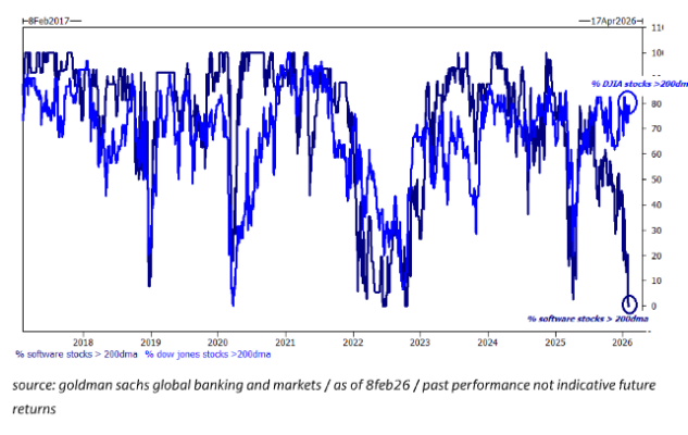 5/ one delta (iii) … ningún valor de software cotiza por encima de su media móvil de 200 días… en contraste, el Dow Jones Industrial Average tiene ~80% de sus componentes por encima de la 200d y acaba de cerrar en máximos históricos… gráfico.
