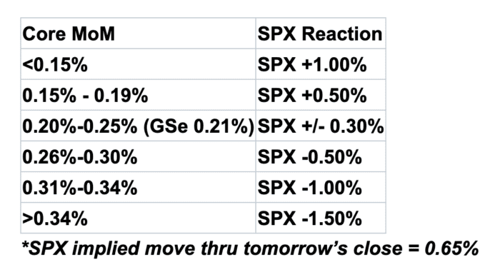 • La configuración para el IPC del jueves se siente muy similar a la del mes pasado. Similar en ambos casos, vimos a los bonos negociar relativamente débiles mientras que las acciones permanecen fuertes, con los inversores en acciones nuevamente optimistas por una impresión de 0.2% en el IPC subyacente MoM y, por lo tanto, reacios a reducir largos antes de cualquier posible aumento posterior a un número ligero. El straddle del jueves cuesta ~39 o 70 puntos básicos, lo que probablemente será inferior a 65 puntos básicos para el final del día. Eso lo convertiría en el straddle de acciones más bajo para el IPC desde finales de 2021 (antes del compromiso de Powell de abordar la inflación). Este IPC se siente como un punto de inflexión en las acciones, al igual que vimos en octubre de 2022. Si retrocedemos casi dos años, la Fed estaba subiendo tasas en 75 puntos básicos por reunión, y aún estábamos imprimiendo números de IPC subyacente MoM de 0.6%. En octubre, la Fed comenzó a preocuparse por la rápida cantidad de endurecimiento en un corto período de tiempo y los posibles “efectos retardados”, y esto fue todo lo que el mercado necesitaba para correr con la narrativa de que el ciclo de aumentos estaba cerca de su fin. Después de esa impresión, vimos que incluso con impresiones altas de IPC, el SPX negoció fuerte, ya que el mercado corría con la narrativa de que los IPC eran unilaterales; en otras palabras, los IPC no podían extender los aumentos, sino solo acelerar los recortes. También es interesante que desde el cambio de la Fed en octubre de 2022, hemos tenido 21 IPC, 18 de los cuales han visto al VIX terminar a la baja el día del IPC. Después de que hemos visto que 5 recortes se descuentan de la curva este año, parece muy probable que el camino para el resto de 2024 sea que la Fed recorte dos veces: una en septiembre y otra en diciembre (por supuesto, siempre existe la posibilidad de muchos recortes si algo malo sucede). Lo que nos preguntamos es que con probablemente la mayor certeza que hemos tenido en un tiempo sobre los próximos 6 meses en la política de la Fed, ¿tienen los IPC ligeros tanto significado para el alza de las acciones como lo han tenido en los últimos 2 años? En otras palabras, si el IPC subyacente MoM imprime 0.2% el jueves, ¿eso cambia algo en los 2 recortes en 2024 que el mercado ha estado esperando durante más de un mes? Nuestra visión es que la dinámica está volviendo a la asimetría para las impresiones altas de IPC. Los IPC fuertes ahora retrasan los recortes, y mientras el mercado de acciones ha ignorado esto todo el año, pensamos que ahora importa a medida que comenzamos a ver una desaceleración en los datos económicos. Nos gusta poseer puts en la cesta del consumidor de ingresos medios, GSXUMIDC.