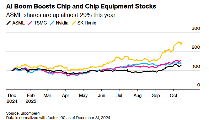 ASML Holding NV superó las expectativas del mercado en pedidos durante el tercer trimestre, impulsada por la fuerte demanda derivada del auge de la inteligencia artificial. La compañía anticipa que sus ventas en 2026 estarán al menos al mismo nivel que en 2025, mostrando una mejora respecto a sus anteriores comentarios más cautos