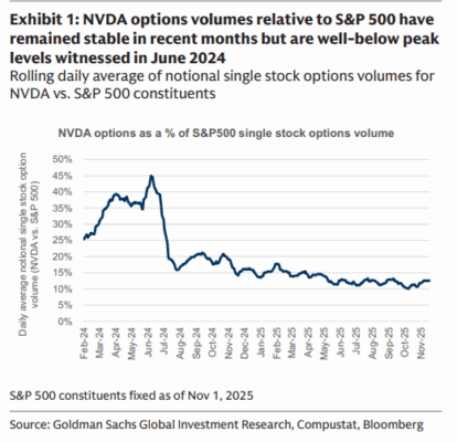 Las opciones de NVDA han estado muy activas, representando el 13% de todo el volumen de opciones de acciones individuales en el último mes; aunque por debajo de los niveles de 2024, sigue siendo de los líderes por volumen monetario.