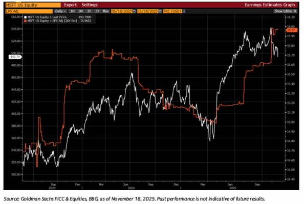 Y MSFT… la acción baja (línea blanca), las cifras suben (línea naranja)… ¿qué está pasando?