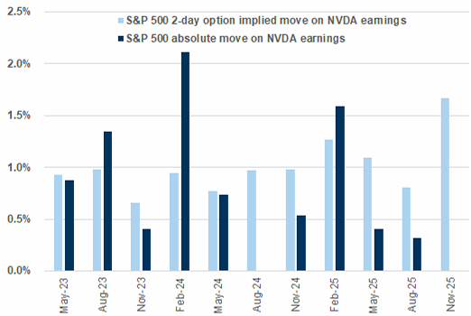 Movimientos realizados del S&P 500 vs. movimientos implícitos a 2 días por opciones durante los resultados de NVDA.