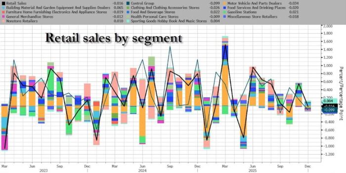 Las ventas minoristas de EE. UU. se estancaron inesperadamente en diciembre de 2025, tras haber subido un 0,6 % en noviembre, y quedaron por debajo de las previsiones, que apuntaban a un avance del 0,4 %.