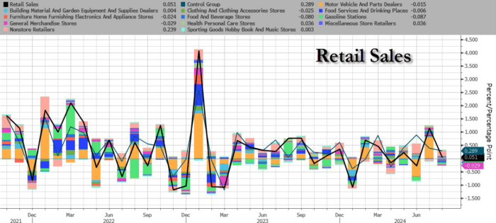 Las ventas minoristas en EE. UU. aumentaron un 0,1% mes a mes en agosto de 2024, después de una revisión al alza del 1,1% en julio, superando las previsiones de una caída del 0,2%, lo que indica que el gasto del consumidor se mantiene relativamente fuerte. Los mayores incrementos se observaron en las ventas de tiendas misceláneas (1,7%); minoristas no especializados (1,4%); tiendas de salud y cuidado personal (0,7%); y tiendas de artículos deportivos, pasatiempos, instrumentos musicales y libros (0,1%). Por otro lado, las ventas disminuyeron en estaciones de gasolina (-1,2%); tiendas de electrónica y electrodomésticos (-1,1%); alimentos y bebidas (-0,7%); muebles y artículos para el hogar (-0,7%); ropa (-0,7%); grandes almacenes (-0,3%); y concesionarios de vehículos de motor y piezas (-0,1%). Mientras tanto, las ventas excluyendo servicios de alimentos, concesionarios de automóviles, tiendas de materiales de construcción y estaciones de gasolina, que se utilizan para calcular el PIB, aumentaron un 0,3%. Los datos de ventas minoristas no están ajustados por inflación e incluyen principalmente bienes.