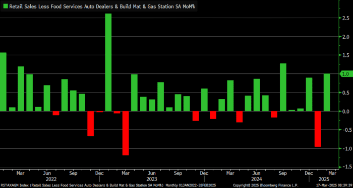 Las ventas excluyendo servicios de alimentos, concesionarios de automóviles, tiendas de materiales de construcción y estaciones de gasolina (se utilizan para calcular el PIB) aumentaron un 1%, revirtiendo una caída revisada a la baja del 1% en enero y superando con creces las previsiones de un aumento del 0,2%.