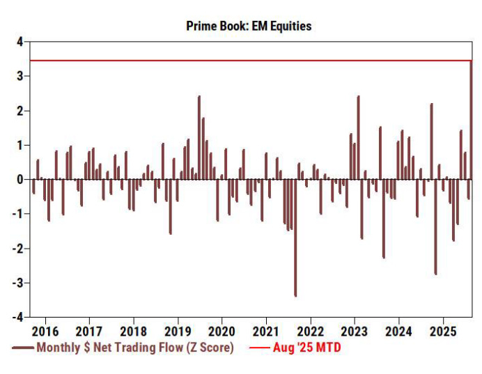 No podemos dejar de señalar que los hedge funds han rotado de forma agresiva hacia acciones de mercados emergentes (lideradas por la renta variable china) en el último mes. Los flujos nominales netos de compra de este mes, tanto en el conjunto de emergentes como en China dentro del Prime book, van camino de ser los mayores de nuestro historial (+3 sigma respecto a los últimos 10 años), impulsados por compras largas.