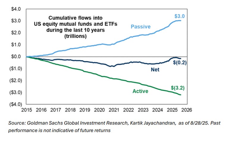 La inversión pasiva minorista está impulsando una mayor divergencia entre fondos activos y pasivos y, dado cómo se construyen los ETFs, estos flujos siguen estando fuertemente concentrados en las Magnificent 7.
