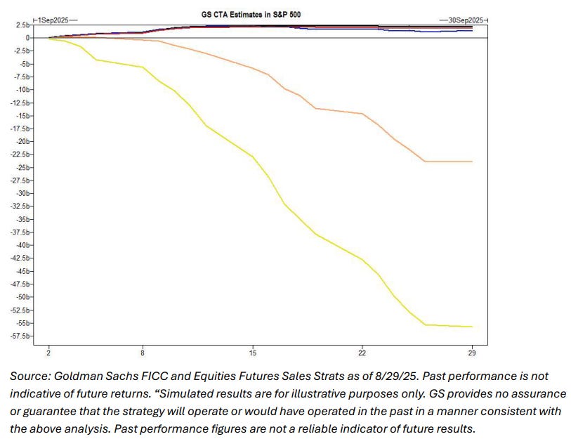 Nuestro modelo de GS estima que los CTAs compraron 12.560 millones de USD en renta variable estadounidense en agosto, lo que supone 15.100 millones menos que en julio (cuando compraron 27.660 millones). Predecimos aún menos para septiembre, donde los modelos proyectan compras por 2.960 millones de USD en renta variable estadounidense en el próximo mes.