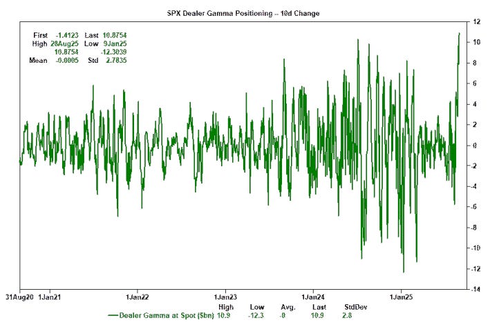 Estimamos que los dealers están largos de gamma, lo que mantendrá al mercado en un rango limitado a nivel de índice. El cambio a 10 días en el posicionamiento en gamma de los dealers es el mayor de nuestra historia, con +10.900 millones de USD.