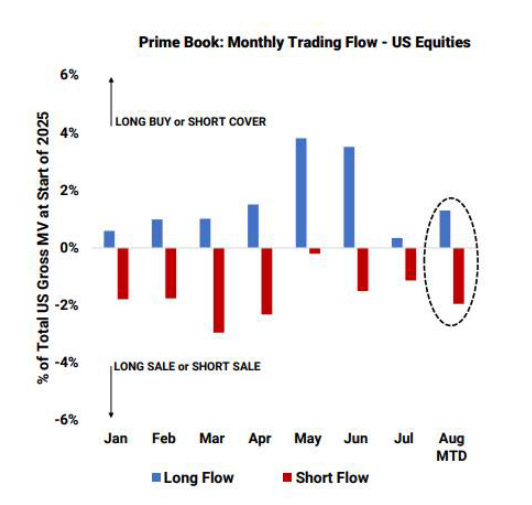 A pesar del repunte continuo del mercado, los hedge funds se encaminan a vender renta variable estadounidense por segundo mes consecutivo, impulsados por ventas en corto que superan a las compras largas tanto en productos macro como en acciones individuales, lo que apunta a una postura más cautelosa de cara a septiembre.