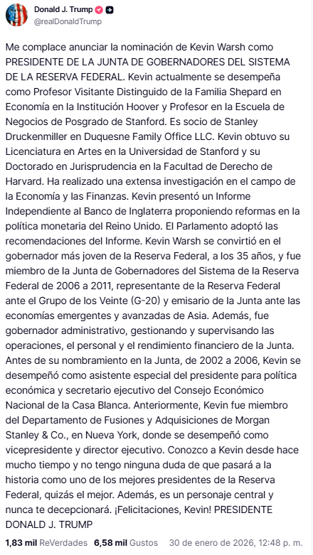- Comentarios recientes: el 17 de noviembre, Warsh escribió que la Fed debería reducir su balance —argumentando que este es el origen de la inflación elevada— y bajar los tipos de interés para apoyar a hogares y empresas.