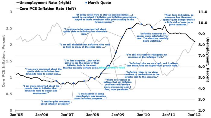 Por ejemplo: Abril de 2009 (siete meses después de Lehman, con el PCE subyacente en 0,8% y el desempleo en 9%) afirmó: “Sigo estando más preocupado por los riesgos al alza de la inflación que por los riesgos a la baja”.